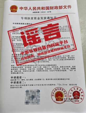 真相:近日,湖南一居民收到不明快遞,內(nèi)有一封以“國(guó)家金融監(jiān)督管理總局”和“中華人民共和國(guó)財(cái)政部”名義發(fā)布的《專項(xiàng)扶貧資金發(fā)放通知書》。該文件稱“中央財(cái)政將在今年四季度增發(fā)扶貧資金10000億元,凡收到本文件的人民群眾,有資格通過QQ掃碼進(jìn)入群聊,聯(lián)系在線客服,或登錄‘中扶在線’平臺(tái)聯(lián)系客服,申請(qǐng)300萬扶貧資金”。