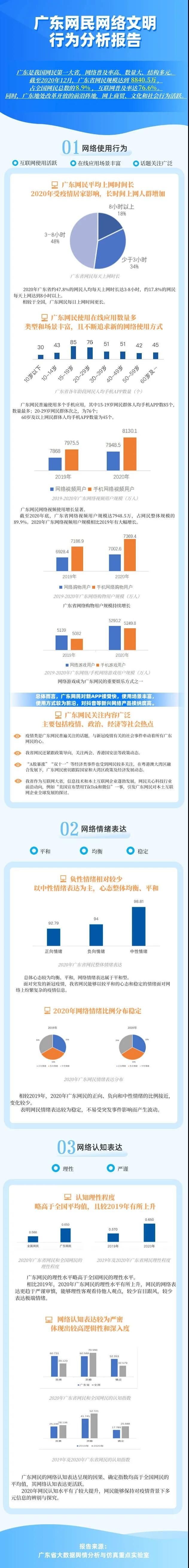 2020年,我國(guó)網(wǎng)民規(guī)模已達(dá)9.89億,廣東的情況如何?7月29日,在2021廣東省網(wǎng)絡(luò)文明宣傳季活動(dòng)的啟動(dòng)儀式上,“廣東網(wǎng)民網(wǎng)絡(luò)文明行為分析”報(bào)告正式發(fā)布。報(bào)告指出,廣東是我國(guó)網(wǎng)民第一大省,截至2020年12月,全省網(wǎng)民規(guī)模達(dá)到8840.5萬(wàn),占全國(guó)網(wǎng)民總數(shù)的8.9%,互聯(lián)網(wǎng)普及率達(dá)76.6%。